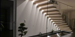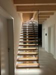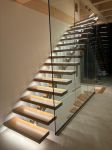 Bei dieser Variante, trägt ein Mittelholm aus Edelstahl-Quadratrohr die Treppenstufen aus Eichenholz. Wieder setzt eine indirekte Beleuchtung durch flächenbündig eingelassene LED-Stripes die Treppe in Szene.